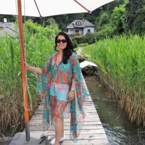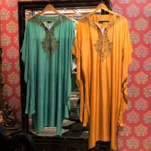 Short silk Kaftans – aqua and tangerine
